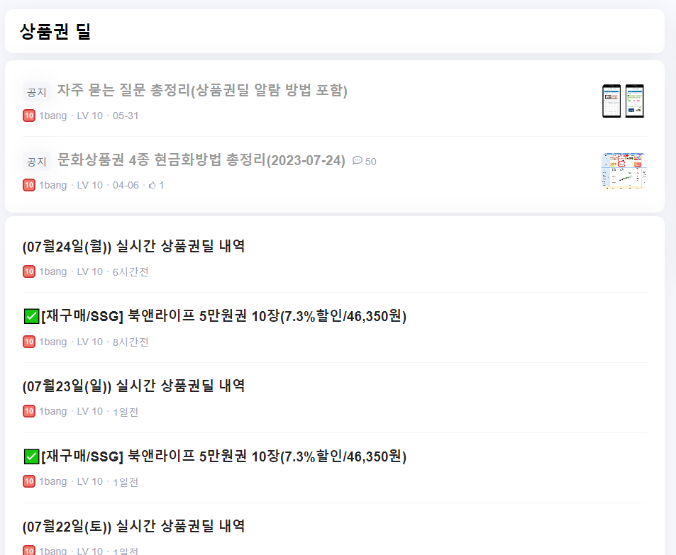 (상테크용 전환한도) 상품권 딜 정보(https://1bang.kr/ticket-deal) 도 실시간을 올라오고,