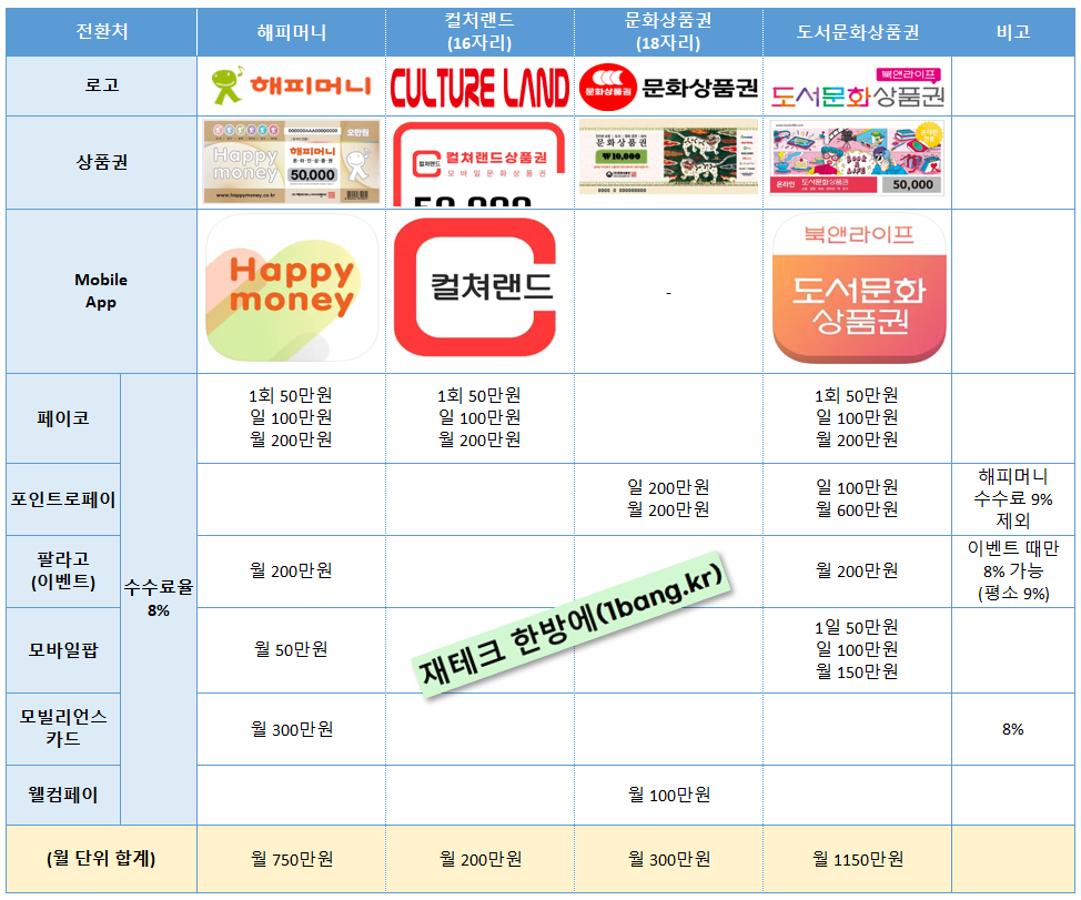 아래 문화상품권 상테크용 전환한도도 잘 정리되어 있고요.