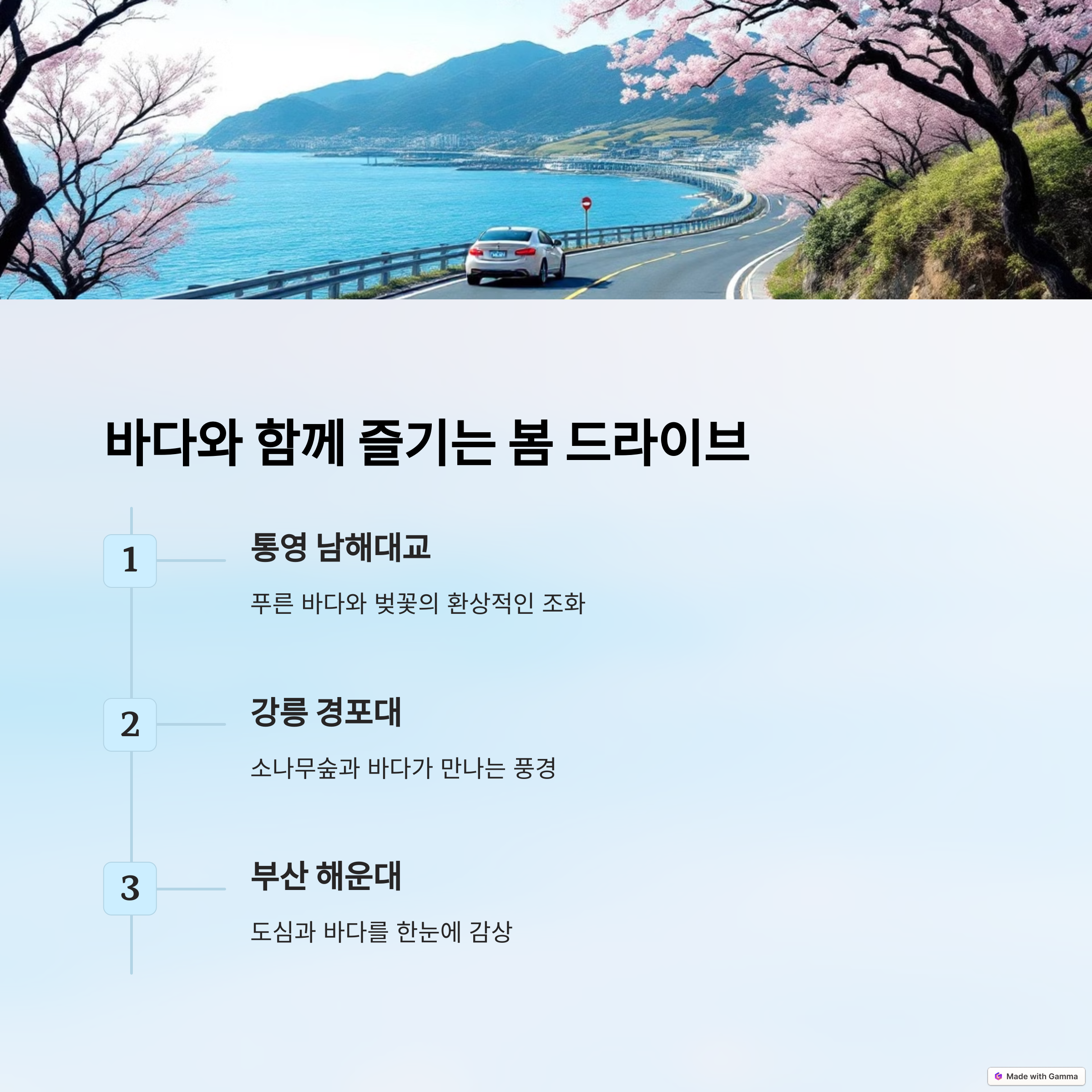 봄이 오면 어디론가 떠나고 싶지 않으세요? 벚꽃이 만개한 길을 걷고, 시원한 바닷바람을 맞으며 진정한 힐링을 경험하는 여행 코스를 소개합니다!