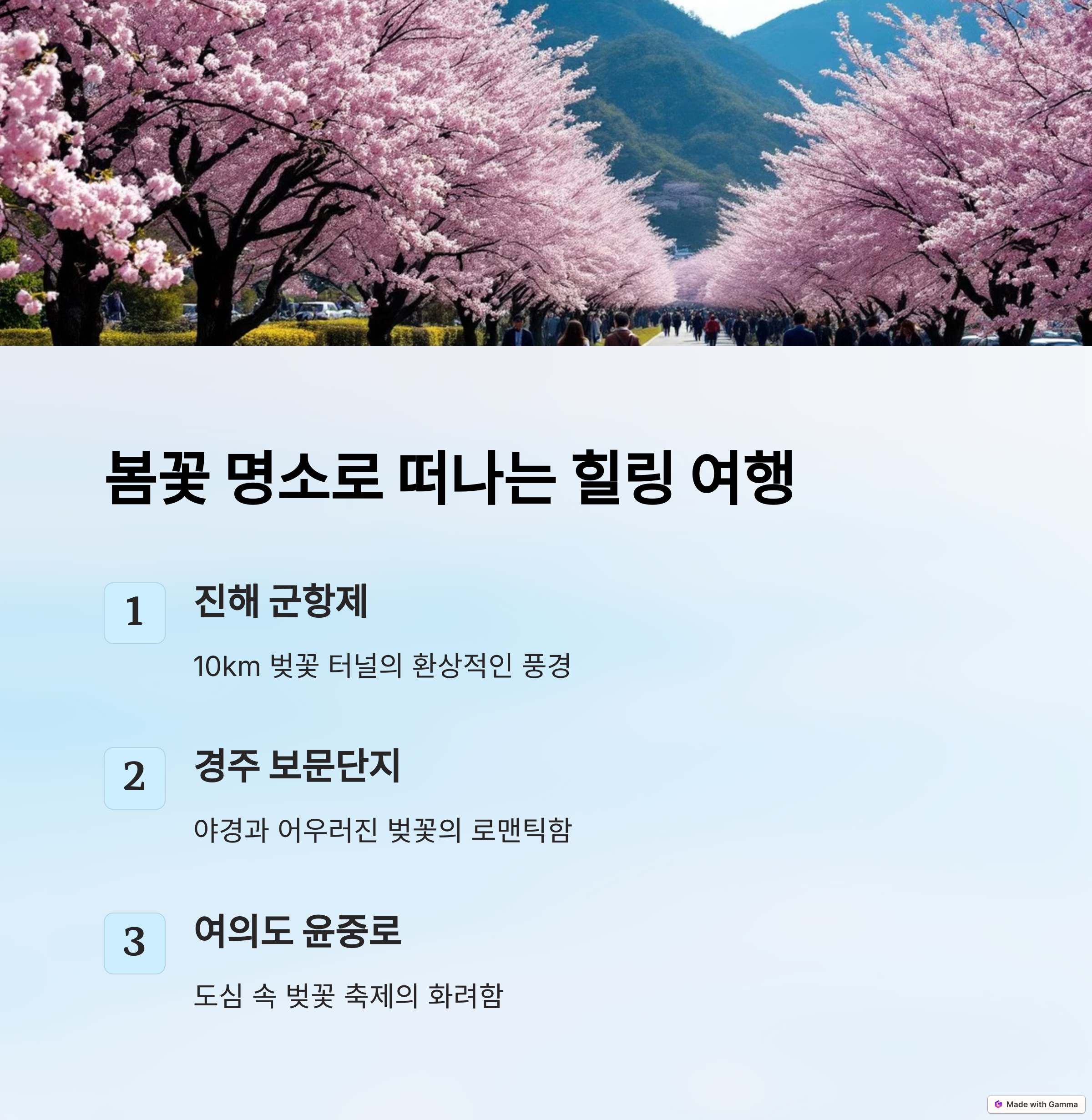 벚꽃부터 바다까지! 최고의 봄 여행 코스 소개 6곳Travel 2025. 3. 14. 02:57