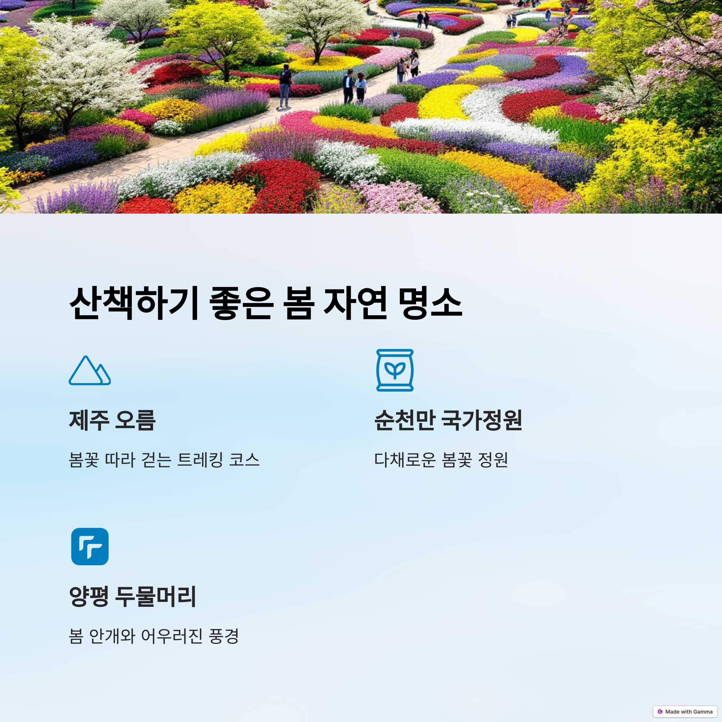 - 남이섬: 자전거를 타고 섬을 한 바퀴 돌며, 푸른 강과 벚꽃을 감상할 수 있어요.