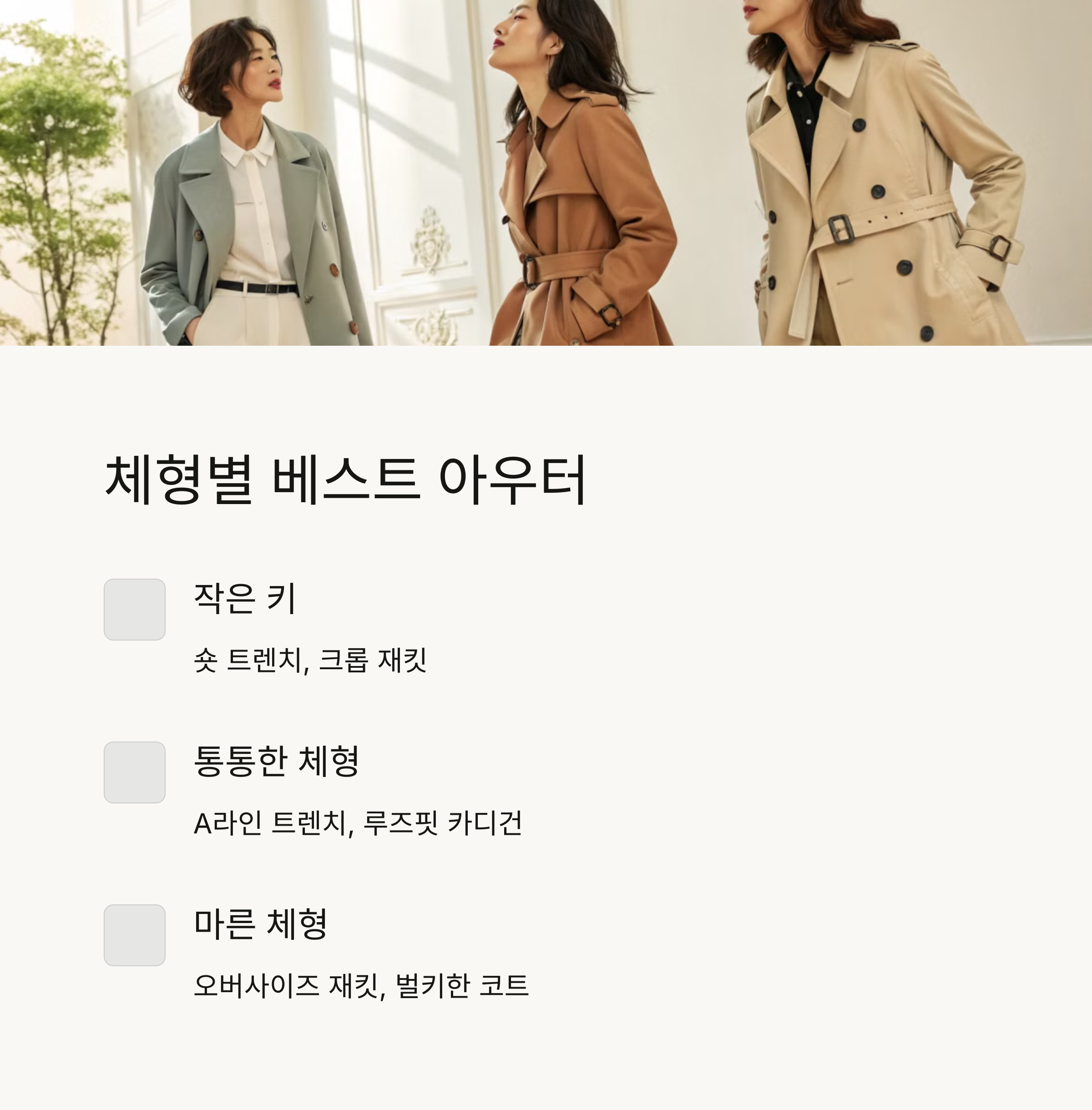 같은 아우터도 누가 입느냐에 따라 느낌이 180도 달라져요! 아래 리스트는 체형별로 어떤 디자인이 잘 어울리는지 정리한 꿀팁이에요.
