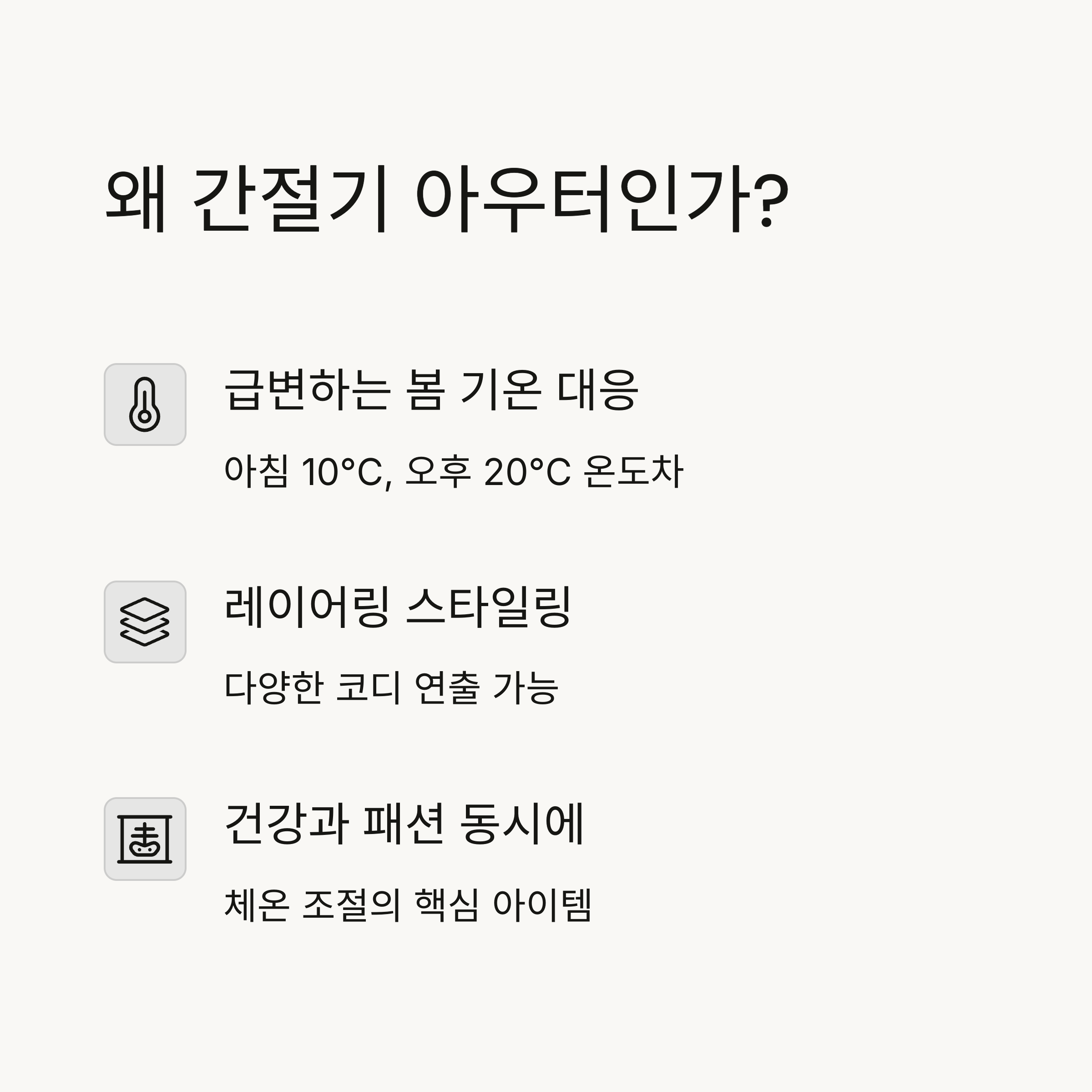 안녕하세요, 패션에 진심인 여러분! 저는 요즘 아침마다 ‘오늘 뭐 입지?’가 일상이 되었어요. 아침엔 춥고 낮엔 더운, 이른바 간절기 시즌이 돌아왔기 때문이죠. 이럴 때 가장 빛을 발하는 아이템은 바로 ‘간절기 아우터’입니다.
